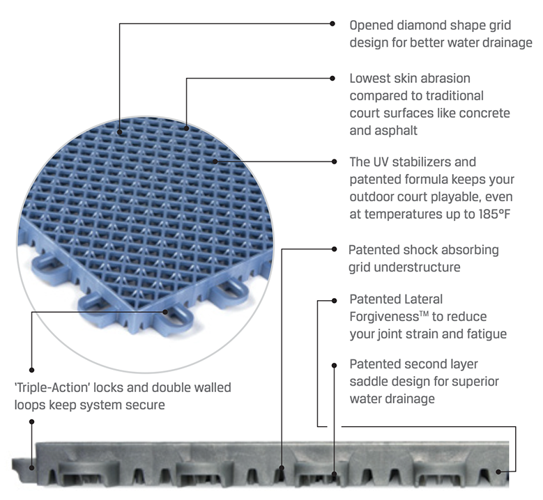 PowerGame+’s unmatched safety and playability make it the perfect court for championship competitions around the world and for your backyard athletes at home. Specially engineered to optimize shock absorption, reduced risk of impact injury and to provide the best combination of abrasion protection and dry traction. The patented Double-Tier shock absorbing grid and Lateral Forgiveness™ reduce joint strain and fatigue to help your family safely play for hours.